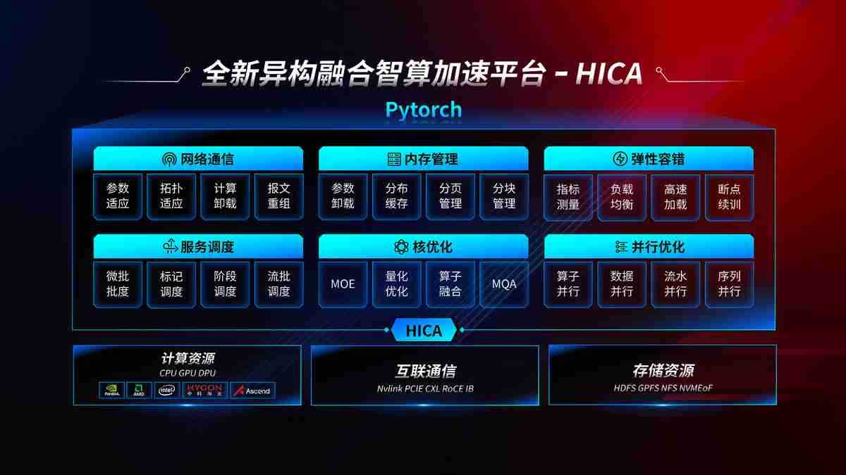 通过自研的服务层、、中间适配层、、、以及调度编排算法,,,采用数据并行、、、模型并行等多种并行方式,,,,把并行计算任务进行有效的分解,,,使其分别由相应的软件栈和算力资源来承接。。。当GPU资源变化,,,HICA可以实时动态调度计算子任务并调整模型拓扑和架构,,,以充分聚合各种算力资源。。。。