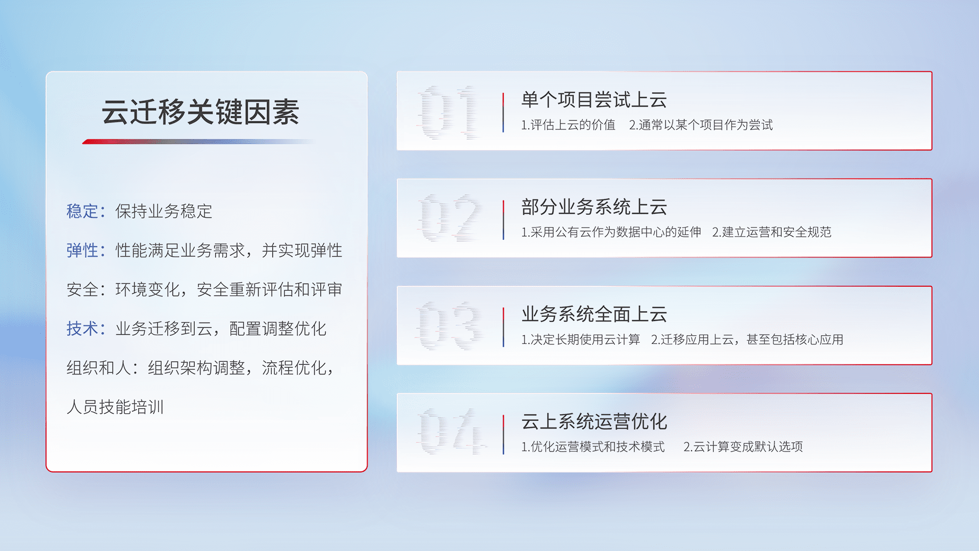 结合实际业务,,,从规划设计、、、、云平台选型、、云原生改造、、、、数据迁移、、、、集成交付,,,迁移全过程为客户识别最佳上云路径,,,做好风险识别管理,,设计网络架构、、、身份权限、、安全审计合规、、、操作审计、、日志审计、、、、监控告警策略、、、、多站点容灾设计等,,,,对云上基础设施进行整体规划,,提升IT治理水平,,以满足弹性、、高可用、、、高性能的需求。。