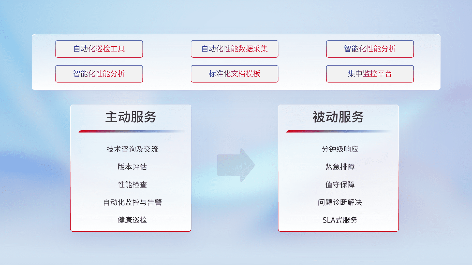 智能化工具和标准化文档,,保障服务质量,,,提供主动服务(包含技术咨询、、、、版本评估、、性能检查、、、自动化监控与告警、、、健康巡检)和被动服务包含(分钟级响应、、、、紧急排障、、值守保障、、问题诊断解决、、、SLA服务)。。